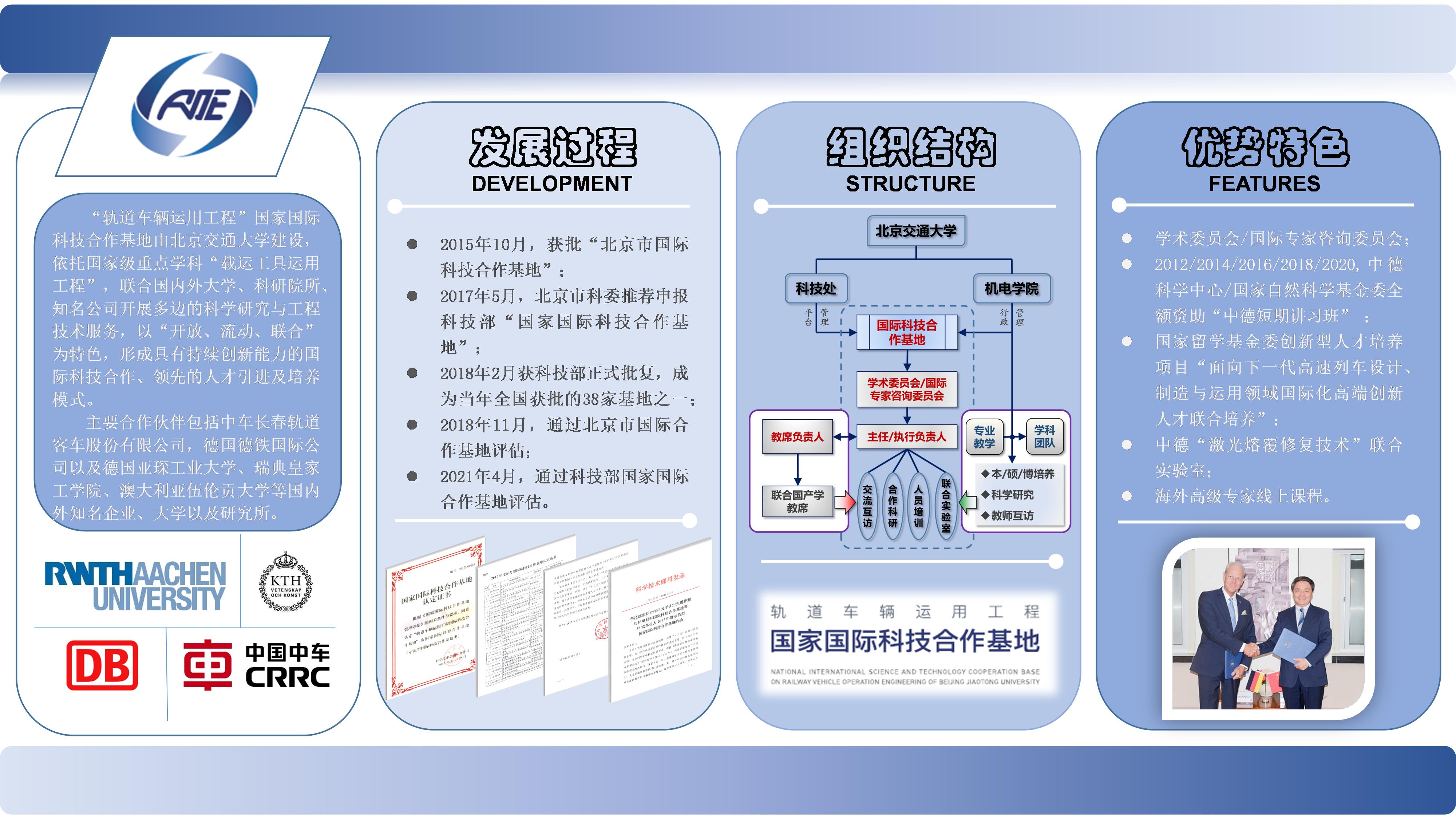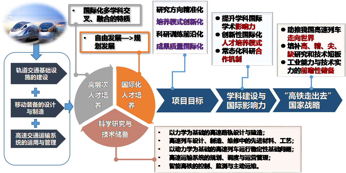 国合基地品牌项目之二:新一代“智能高铁”建设、制造与运用国际化创新人才联合培养的,由国家留学基金委资助,其目标在于持续提升学校“双一流”学科建设水平、人才培养质量及国际学术影响力,助推我国高速列车工业领域的先进技术走向世界,为实现“高铁走出去”等国家战略做出贡献。项目围绕高端人才培养,以科学研究、技术储备为牵引,结合德国亚琛工业大学、瑞典皇家工学院、雅典国家技术大学、意大利雷焦卡拉布里亚地中海大学4个国际一流大学的学术优势与特色学科,以“研究方向精准化、培养模式创新化、科研训练前沿化、成果质量国际化”的标准和要求建立联合培养模式,培养具有国际视野,通晓国际文化、能够在国内外从事轨道交通建设、制造与运用的高端精英人才。
