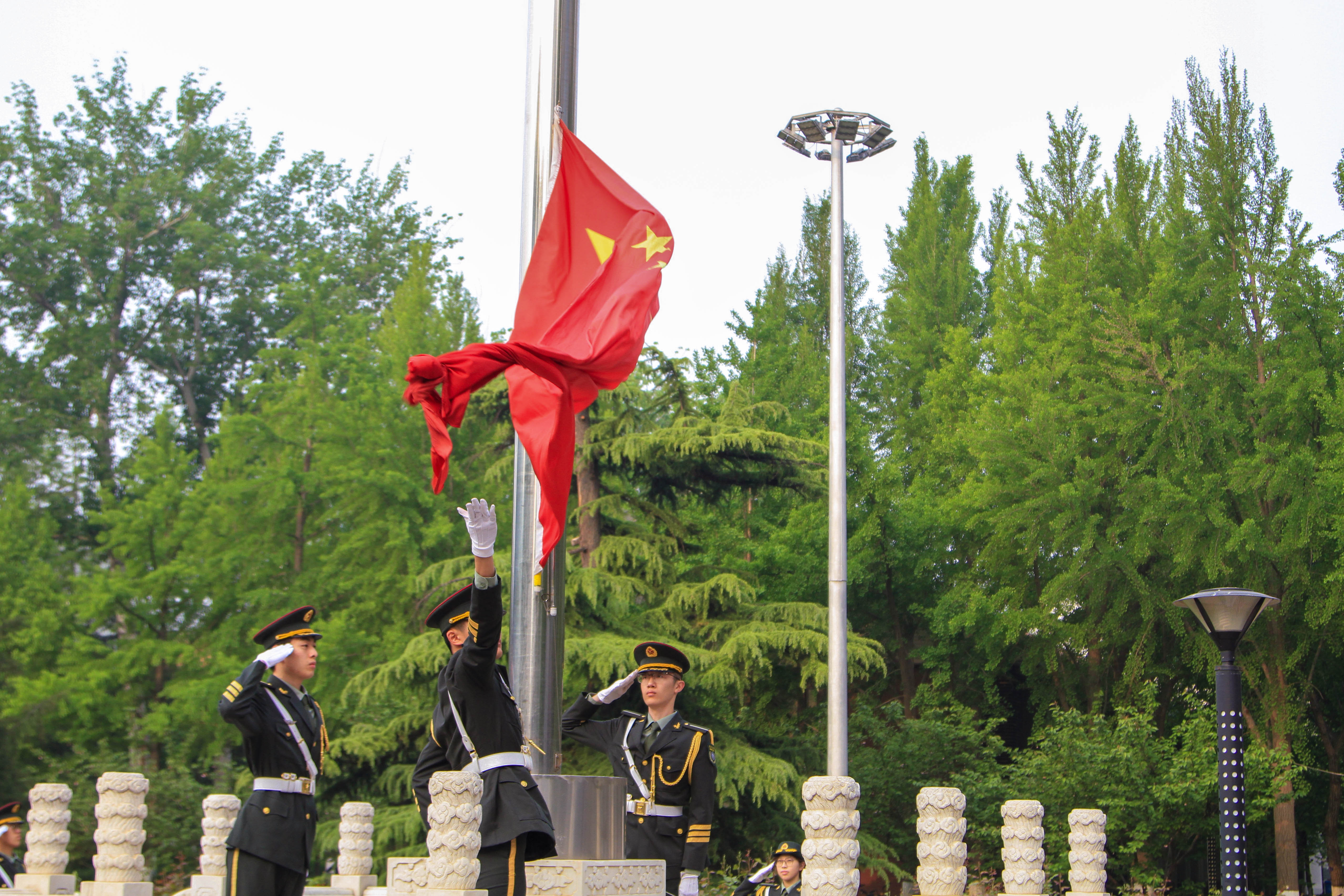 魏旺强向国旗仪仗队授旗。国旗仪仗队队列整齐划一,步伐铿锵有力,缓缓走向升旗台。全场师生庄严唱响国歌,向国旗行注目礼,极大地激发了同学们的爱国热情。
